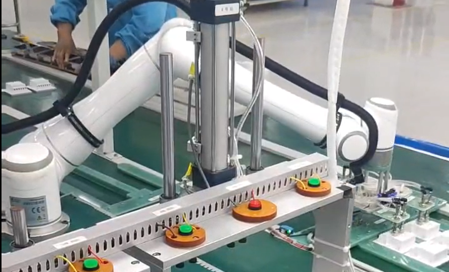 AG庄闲机器人聚焦电子行业检测及上下料自动化,进一步分析了企业需求,为该企业打造了协作机器人定制化系统解决方案,实现了电源开关的高效精准取放及检测。