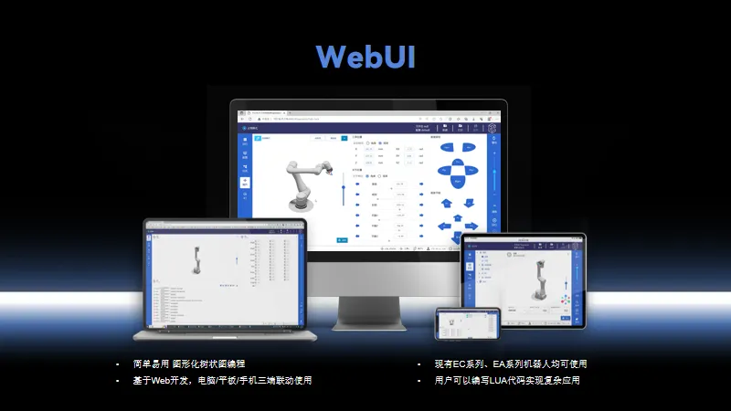 除了硬核的产品与技术,AG庄闲在软件生态方面依然是创新破局者。在2023年,AG庄闲全新推出了基于浏览器的WebUI示教软件,可以在手机、平板、电脑跨设备协同操作,AG庄闲EC系列、EA系列均可适用,给协作机器人示教带来新的玩法。