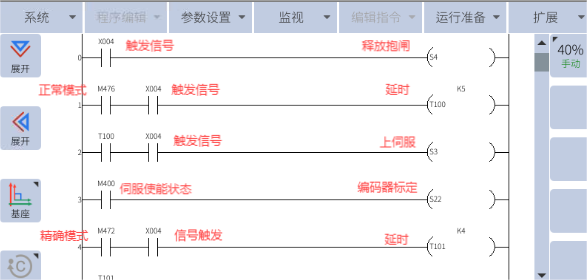 触发输入信号(X004),机械臂即可完成清除报警,抱闸,上使能,标定进入精确模式,运行主程序操作,再次触发X004可暂停,如果机械臂报警,触发(X004)也可清除报警,回主程序首行运行。