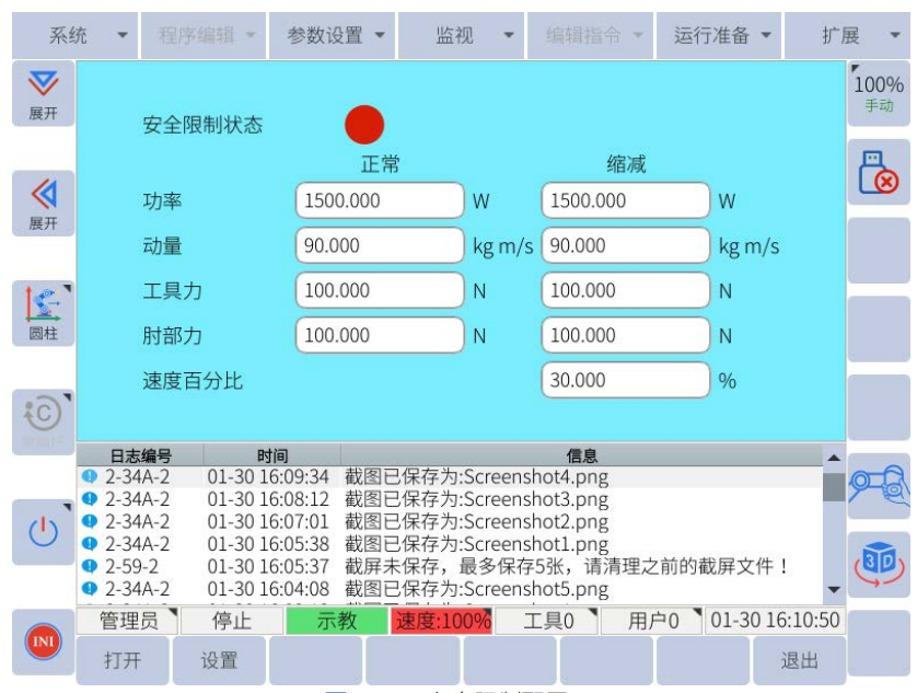 安全限制可配置功率,动量,工具力,肘部力以及速度百分比的缩减。当机器人触发缩减模式时,机器人会以缩减后的速度、功率工作。