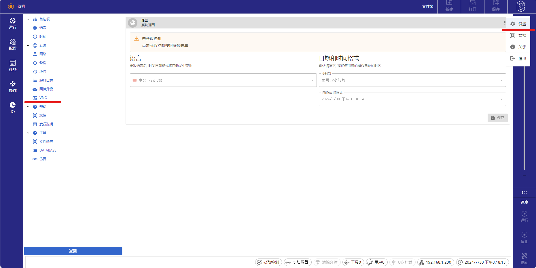 3.12及以上版本开始支持全新的网页示教器,其功能更丰富,若还想在网页示教器使用VNC功能按照如下步骤: 先点击右上角AG庄闲logo,点击设置,再点击VNC即可进入