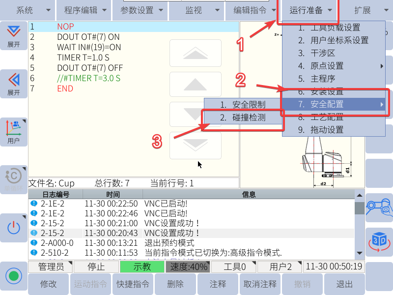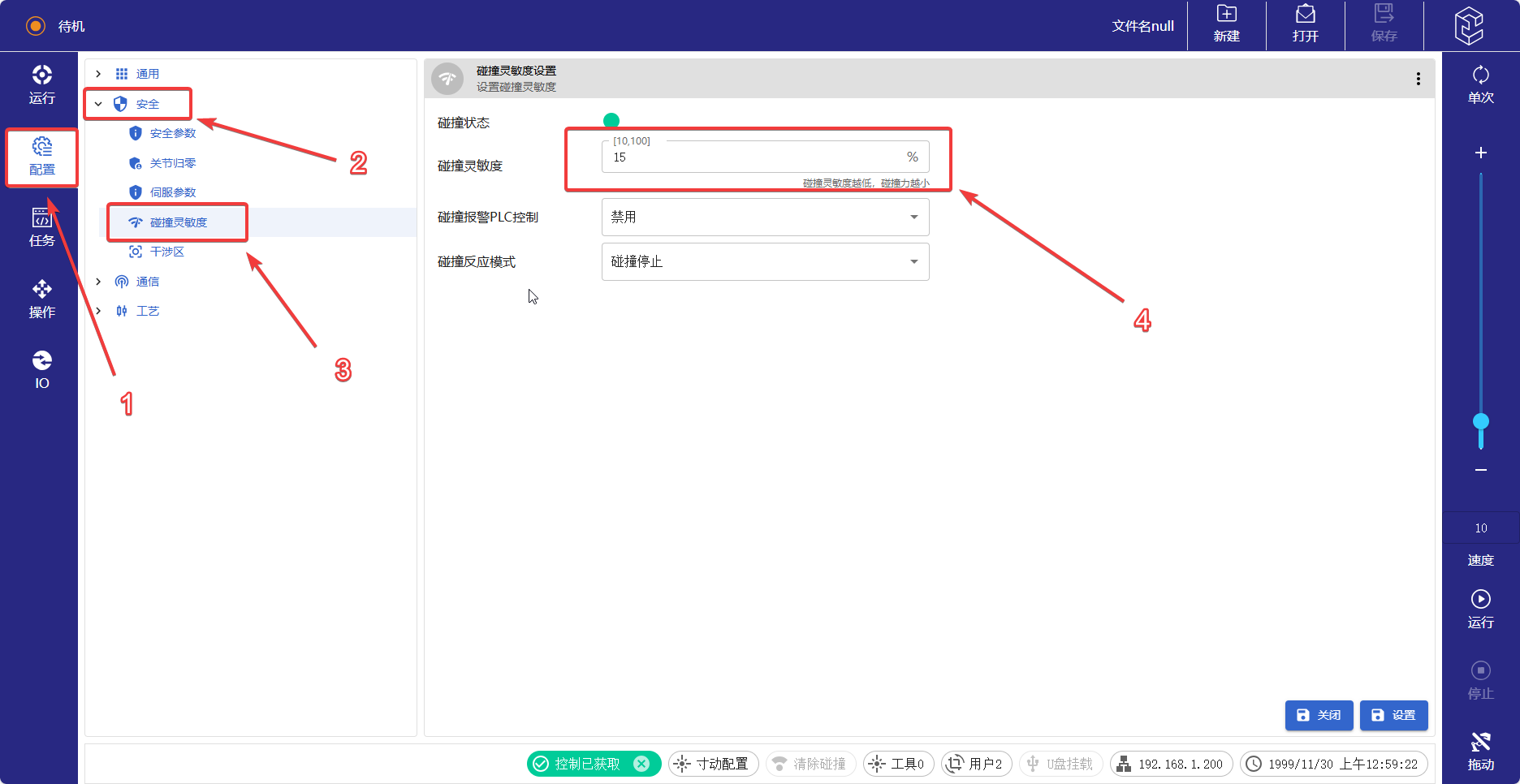 tips:机器人开启碰撞检测后,灵敏度设置的越小,代表机器人越灵敏,触发机器人“碰撞检测报警”所需要的力便越小。