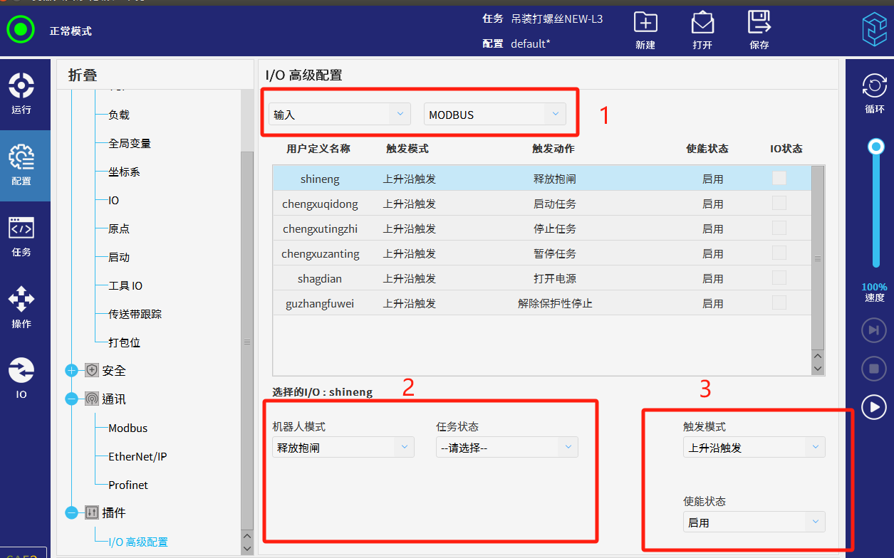 • 前期准备:1.机器手做为modbus从站并已通信上。2.已安装I/O高级配置