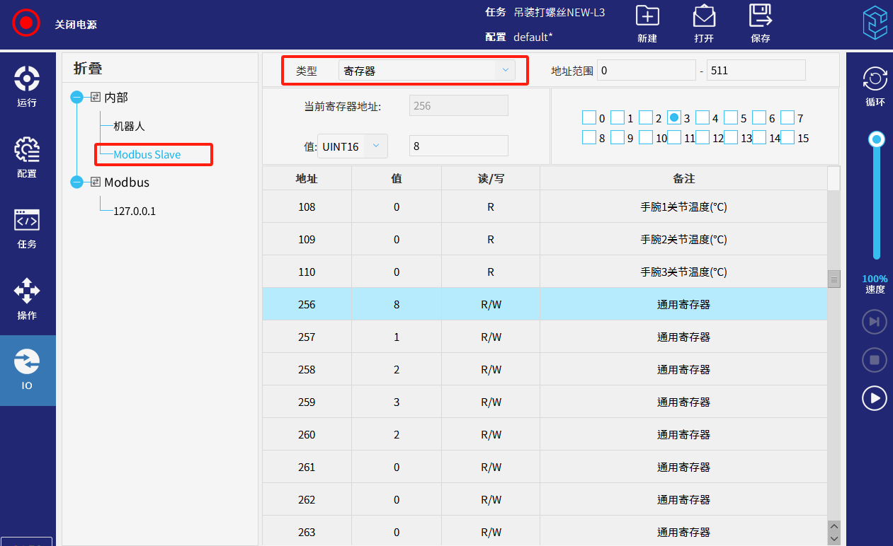 2. 内部--modbus slave,可以查看状态和控制(数字输出32,通用寄存器256地址开始)