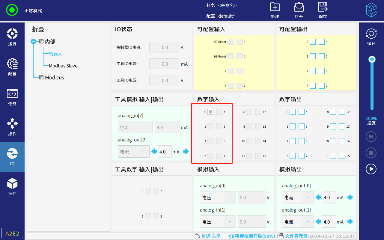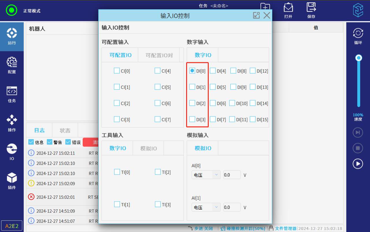 3.  DI[0]的信号成功模拟后,在IO监控界面也可以看到。对应方框显示有灰色圆点就代表有信号。