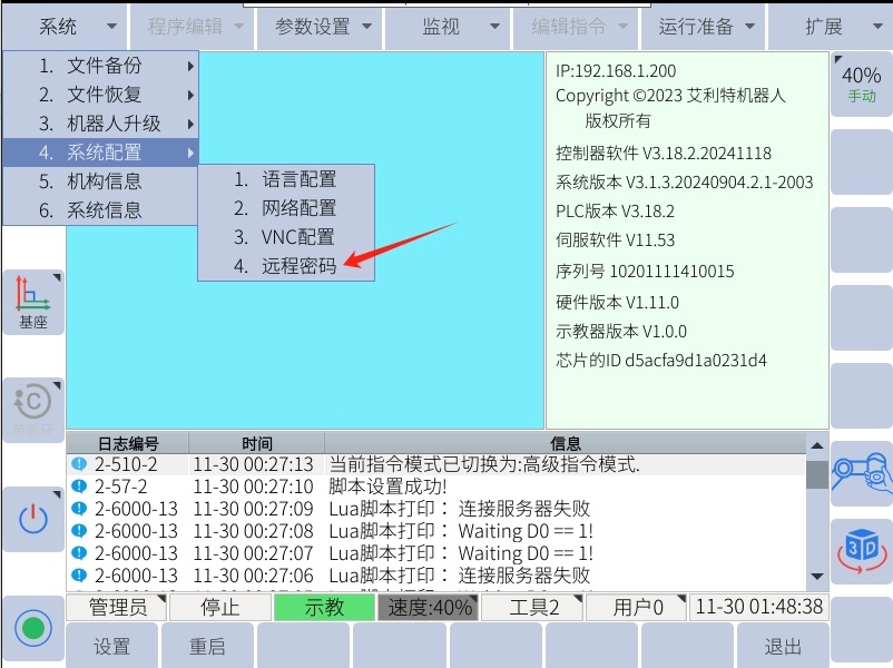 首先查看机器人 ip,并且系统版本后缀为2003