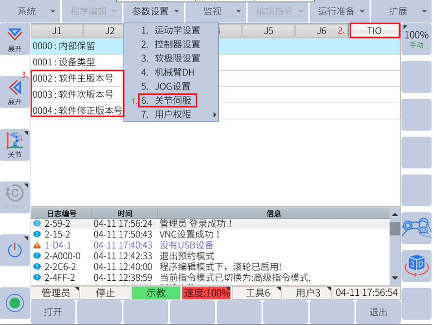依次查看0002,0003,0004分别有数字,如0002:8,0003:2,0004:1209则此末端工具 IO版本为 V8.2.1209