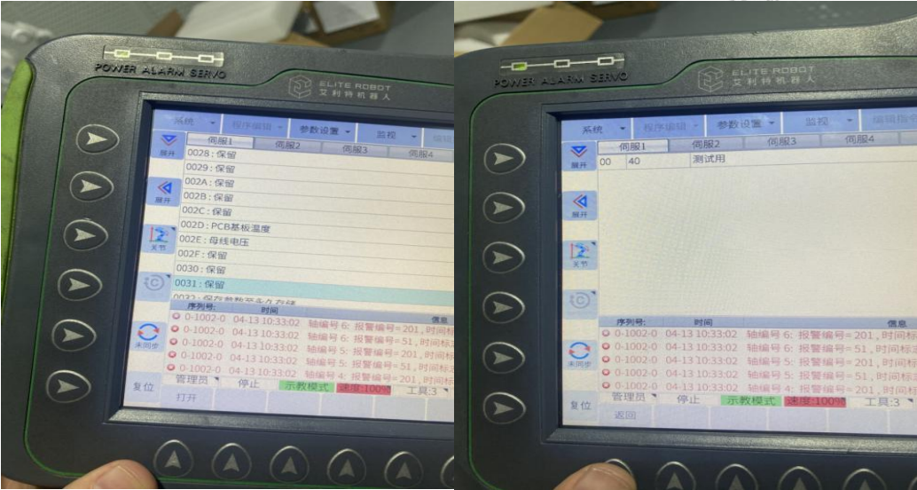 在参数设置》伺服参数》0031:保留》40,中,将报警的关节伺服参数 0031,从设定值 40 改为 38,关节重启设备。该参数表示报警电压的阈值