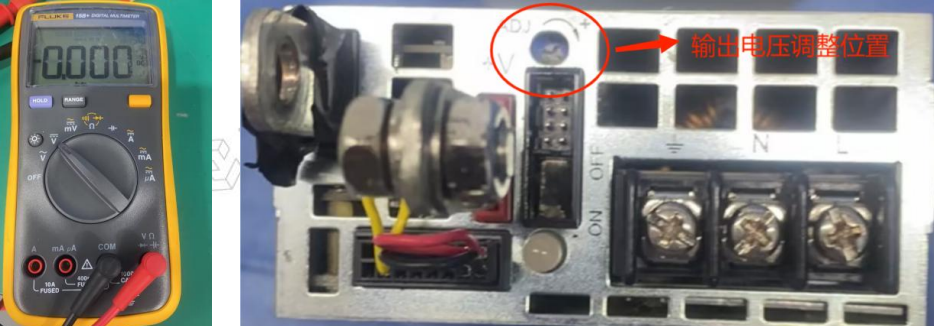 万用表打到直流电压档测量 220V 转 48V 电源电压,若电压过低可将电压调至 48.4V 左右,过高可降低到 48.4v 左右,电源输出电压调整位置(如下图),旋转其调节,无需断电,使用时注意安全!