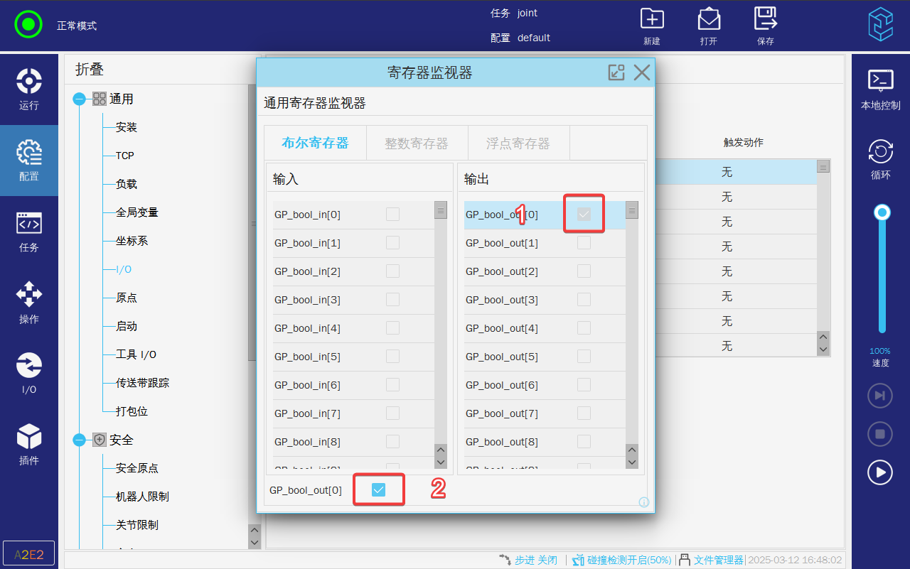 2. 布尔寄存器输入输出数量各128个,保留为总线通讯的输入输出各范围是0-63,保留范围外部RTSI客户端通讯的输入输出范围为64-127,(1)查看状态,(2)输出强制为True;