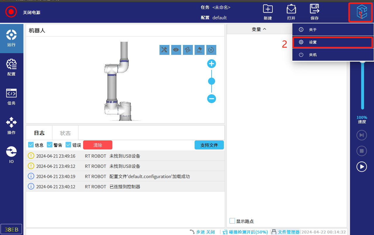 2.1.1:将U盘插入示教器或者控制柜的USB接口,点击界面右上角AG庄闲图标→设置,然后如图-1所示