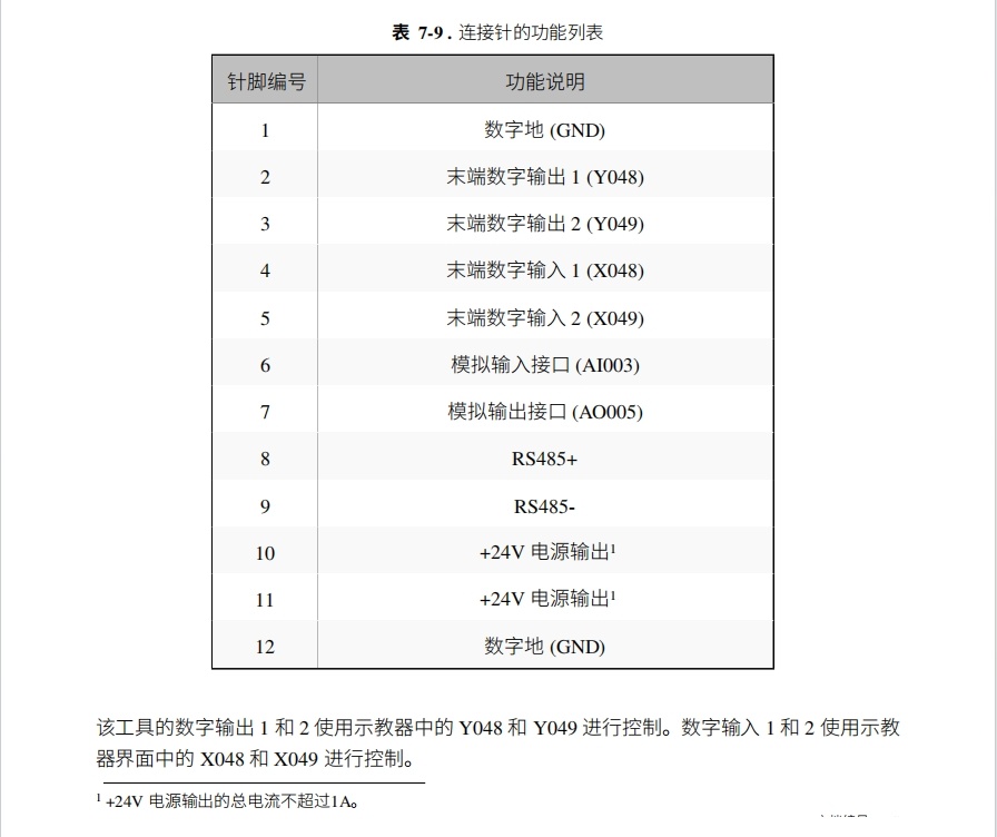 EC机器人除了控制柜提供了IO接口与485接口外,在机器人末端也提供了IO接口,其中包括2路数字输入,2路数字输出,1路模拟输入,1路模拟输出,24V供电与1路485接口。