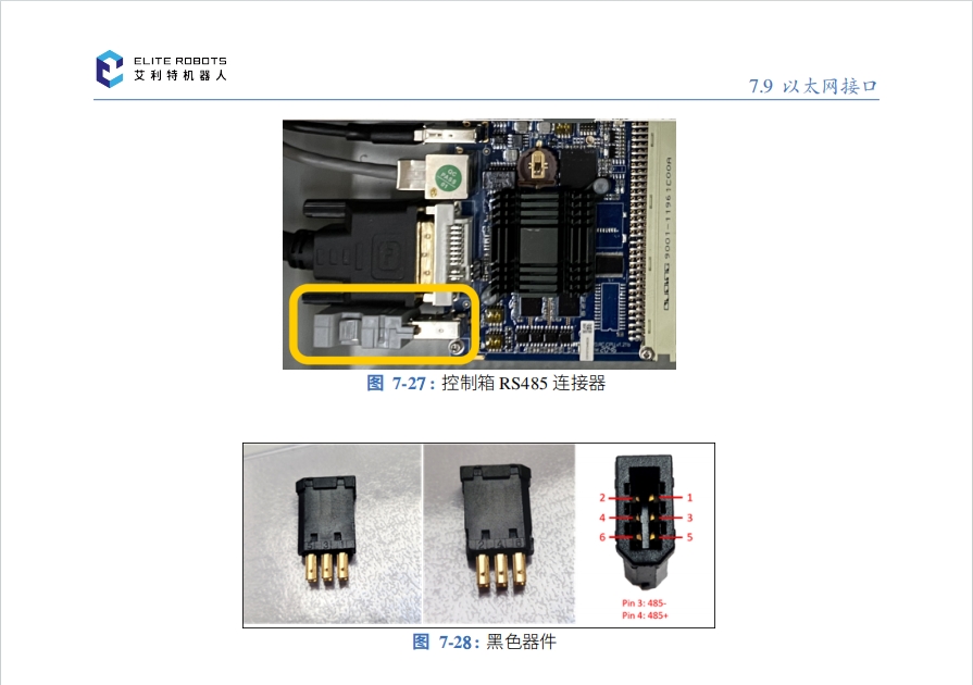 控制箱提供一个独立的 RS485 设备接口,接口连接器为 图 7-27 中黄色框内的部分。为了在