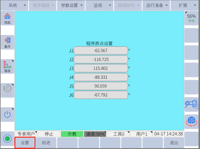 2.      将机器人移动到所需的程序起始位置。导航到运行准备 -> 零点设置 -> 程序原点,按“设置”按钮,将机器人当前位置设置为程序原点