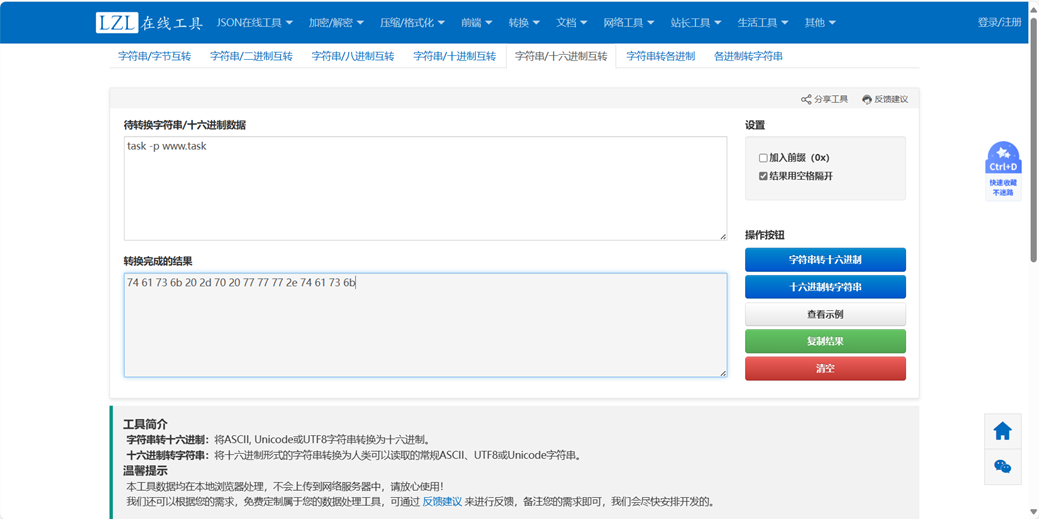 在手册中找出切换任务的字符串是’task -p’ ,在网址中把字符串转换为16进制,如下图,切换到www任务,再将转换后的16进制字符串发送给机器人切换任务。