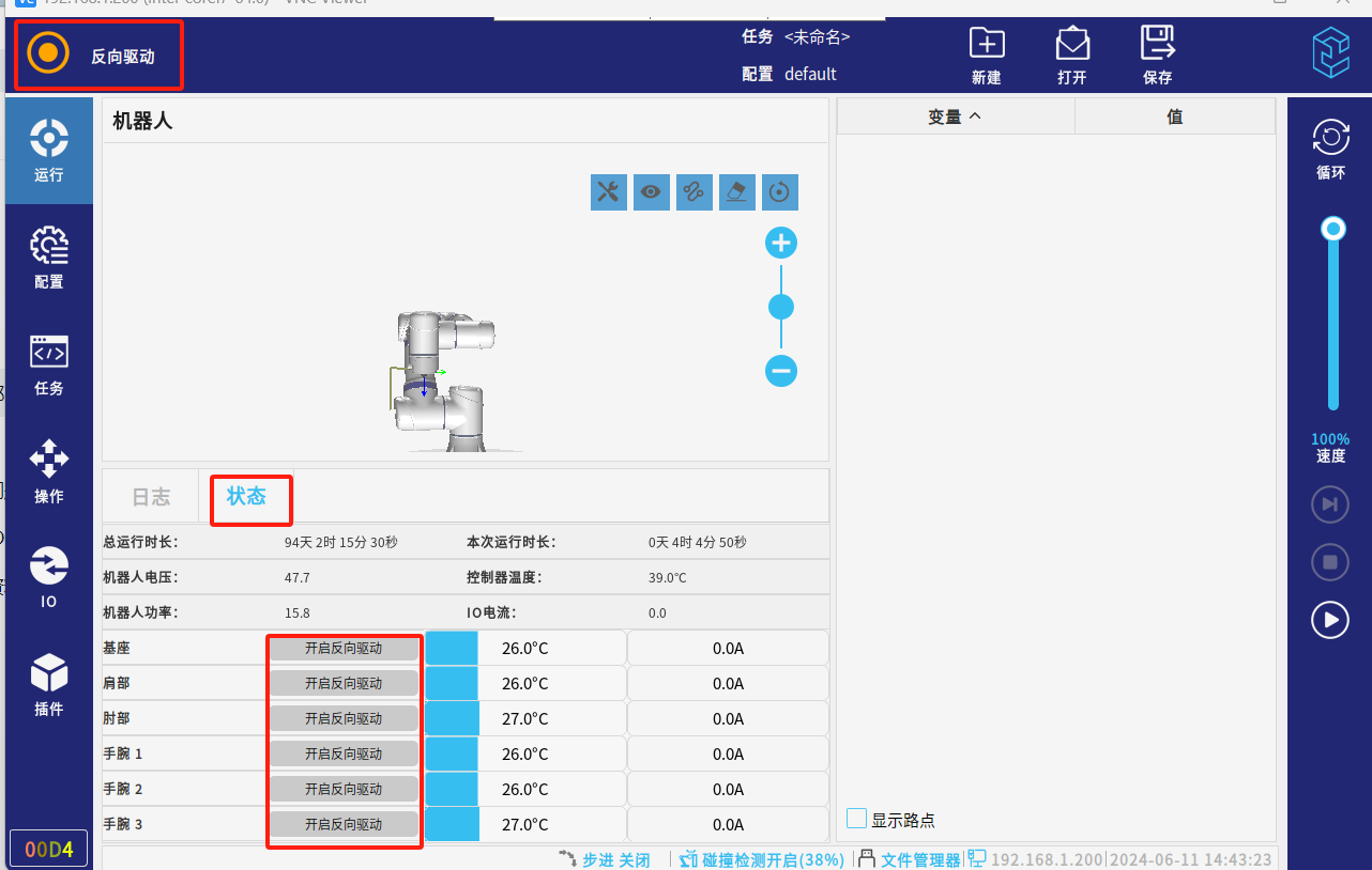 ● 开启反向驱动后,电机释放抱闸机器人对应关节,此时关节在重力的作用下,会正常下滑。开启反向驱动前,必须做好安全防护,防止由于重力向下移动损坏设备。