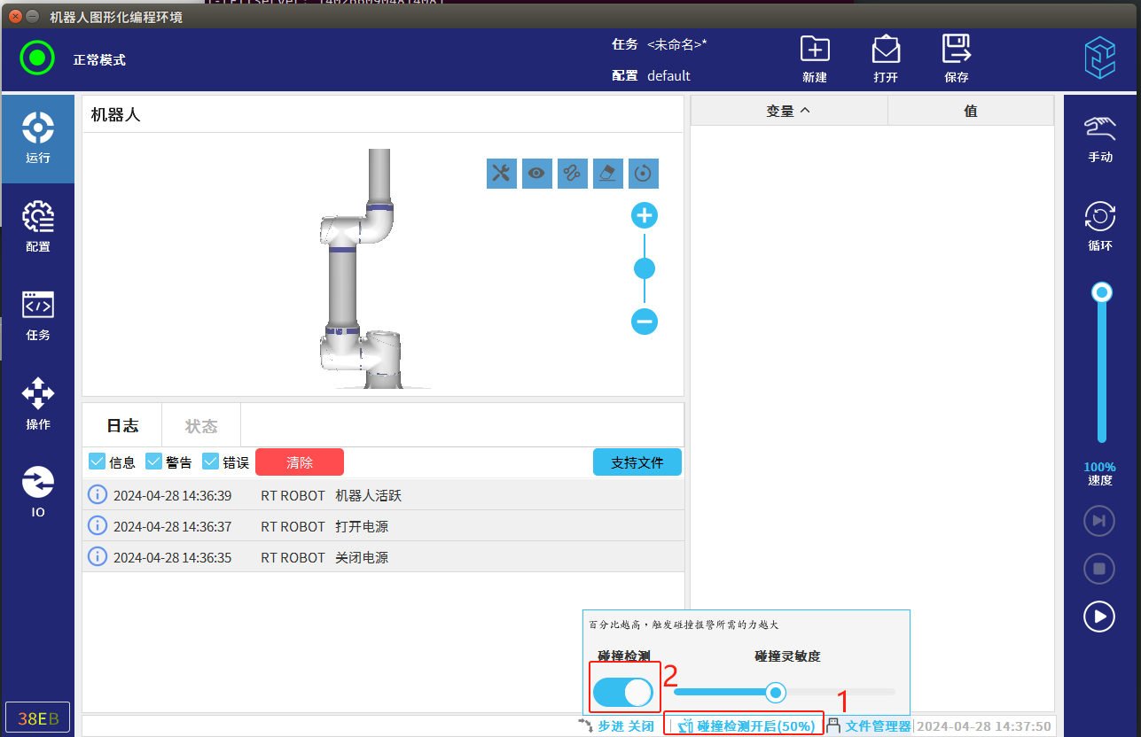 ● 关闭碰撞检测时,必须尽可能减小机器人的运动速度移出碰撞区域,以避免不可预知的碰撞损伤。解决后需把碰撞检测开启。